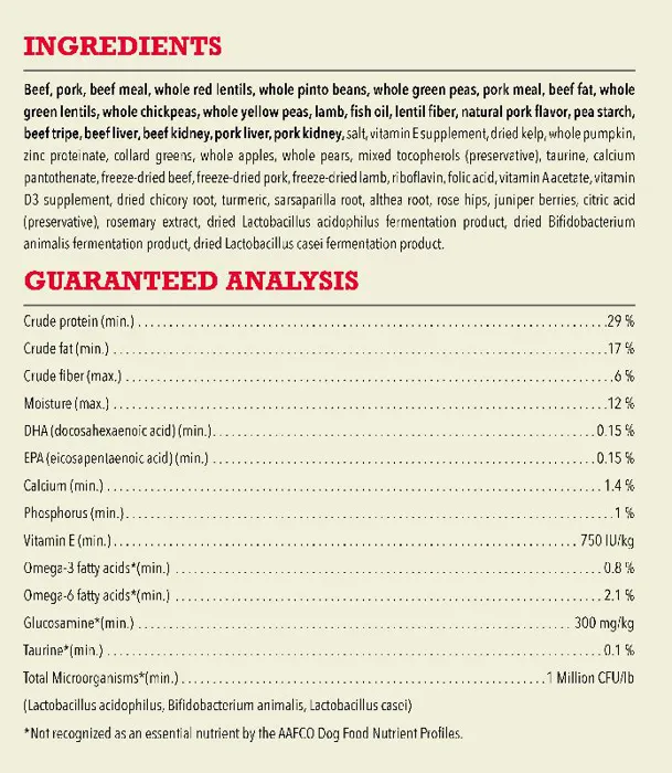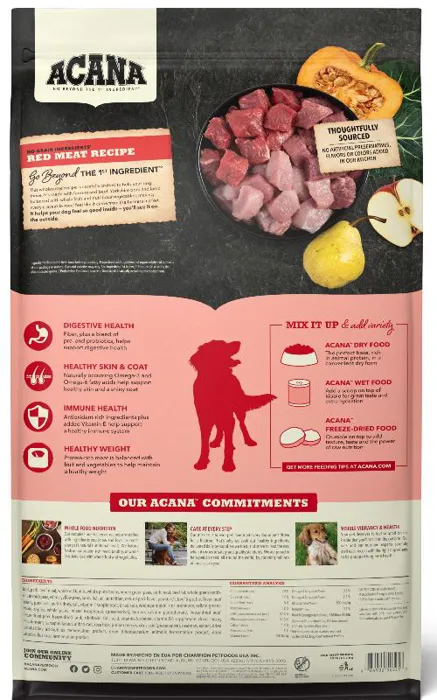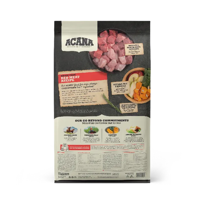 Our ACANA® foods always goes beyond the 1st ingredient, thoughtfully crafting our recipes from start to finish. ACANA Red Meat recipe is balanced with 60%* quality animal ingredients like ranch-raised beef and Yorkshire pork, and 40%+ fruits, vegetables, and botanicals. Artificial colors, flavors or preservatives are never added in our kitchen. Our premium ingredients come from a curated group of farmers, ranchers and fishers we’ve known and trusted for decades, and we approach every batch with an unsurpassed commitment to safety and quality in our award-winning Kentucky kitchen. The result is a protein-rich, nutritious, and delicious dog food to help them live a healthy, happy life. *approximate and derived from the unprocessed state of the ingredients. +we also add vitamins, minerals, natural preservatives and probiotics.