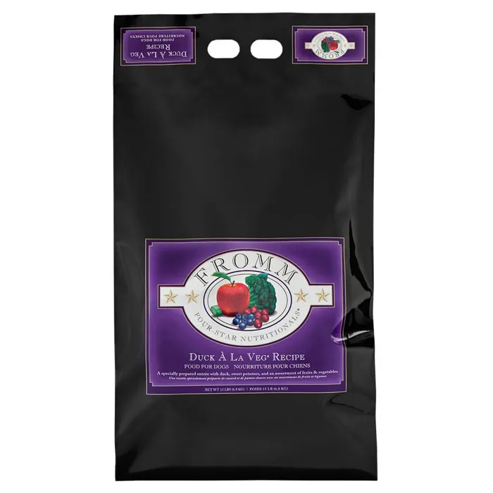 Keeping the needs of your dog in mind, Fromm Four Star Duck and Sweet Potato Dry Dog Food is made to support all breeds and sizes. Made with high quality protein and paired with fresh produce including sweet potatoes and carrots, Fromm Four Star Duck and Sweet Potato Dry Dog Food provides well rounded, balanced nutrition for your furry friend without the unnecessary fillers! This recipe also supports the health of your dog‰ۡó»s coat and skin with guaranteed levels of Omega fatty acids and is enhanced with probiotics to ensure that their digestion is right on track! Fromm Four Star Duck and Sweet Potato Dry Dog Food is made with quality ingredients found in the United States with no artificial colors, flavors, or preservatives that any pup is sure to love!