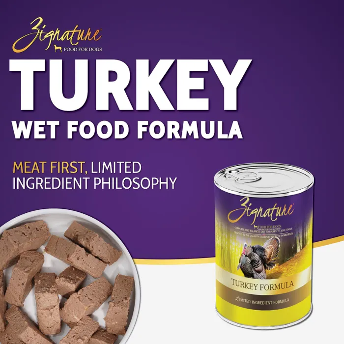 Fill your best friend's bowl with wholesome nutrition when you feed them Zignature Turkey Limited Ingredient Formula Grain-Free Canned Dog Food. Your pup will enjoy a delicious dinner made with real, farm-raised Turkey from the American Midwest, wholesome peas, chickpeas, and carrots. This meat-first recipe offers pups the protein they need to thrive, while Zignature's limited ingredient recipe throws out troublesome ingredients like chicken, corn, wheat, soy, and potatoes, creating peak hypoallergenic, low-glycemic nutrition. Combine that with key antioxidants, essential fatty acids, and a complete spectrum of vitamins and minerals for a well-rounded meal that goes beyond nature to become your pet's signature food for life.